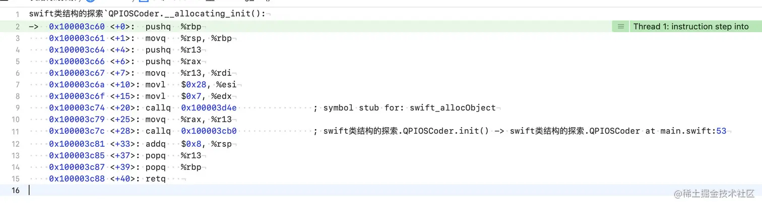 可以很明显看到,继承自NSObject,对象创建就调用objc_allocWithZone函数及objc_msgSend函数。