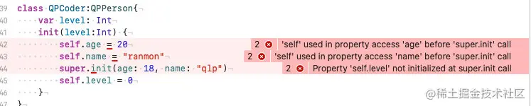 ·指定初始化器必须保证向上委托给父类初始化器之前,本类引入的所有属性都要初始化完成。