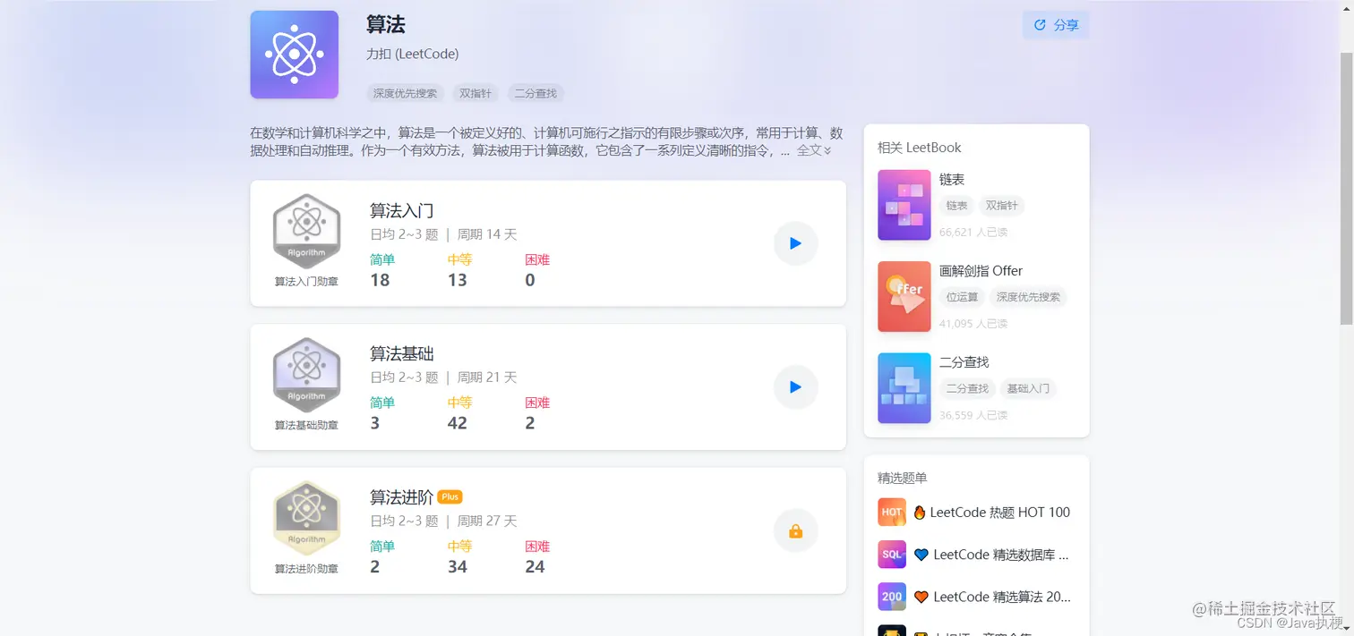 等你试水完毕有了一定做题经验后,我推荐你去参加力扣的学习计划专栏,这些都是免费的,从双指针到动规和数据结构都有,可以帮你一步一步帮你训练出优秀的算法能力。