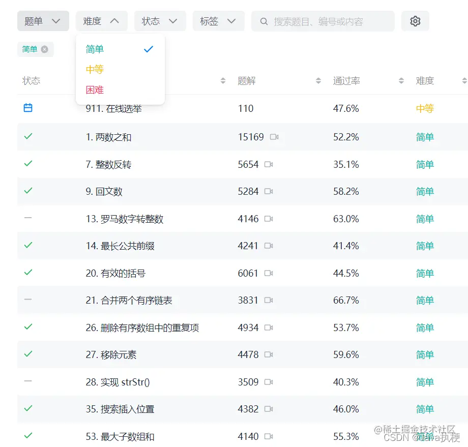 在这选择难度简单,然后挑一些题解量高,通过率过的题目试试水。 这类题目基本比较简单,不会涉及到什么算法,每次提交成功都可以激发你学习算法的兴趣。即使做不出来里面也有许多大佬的题解五花八门,让你们一眼看懂他们的神奇思路。有的人总是好高骛远,入门就去学什么贪心动态,一道题看两三个钟头,结果最后题解都看不懂,这是学习算法的大忌。