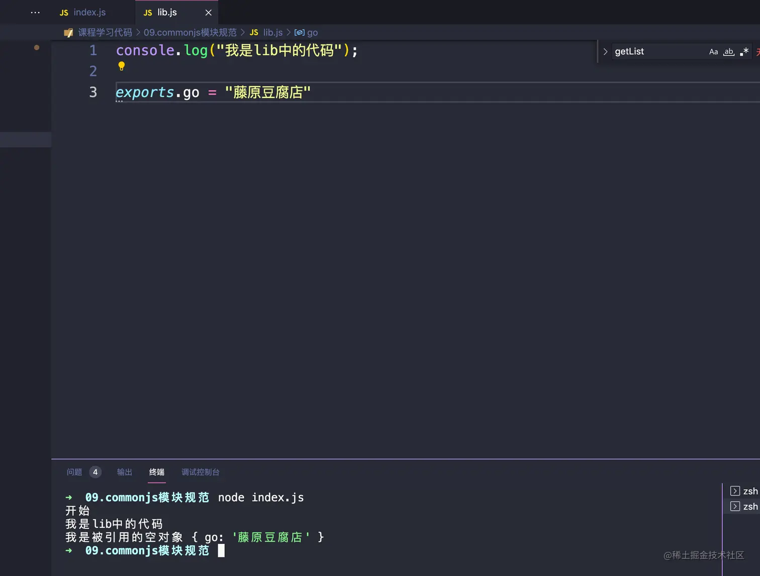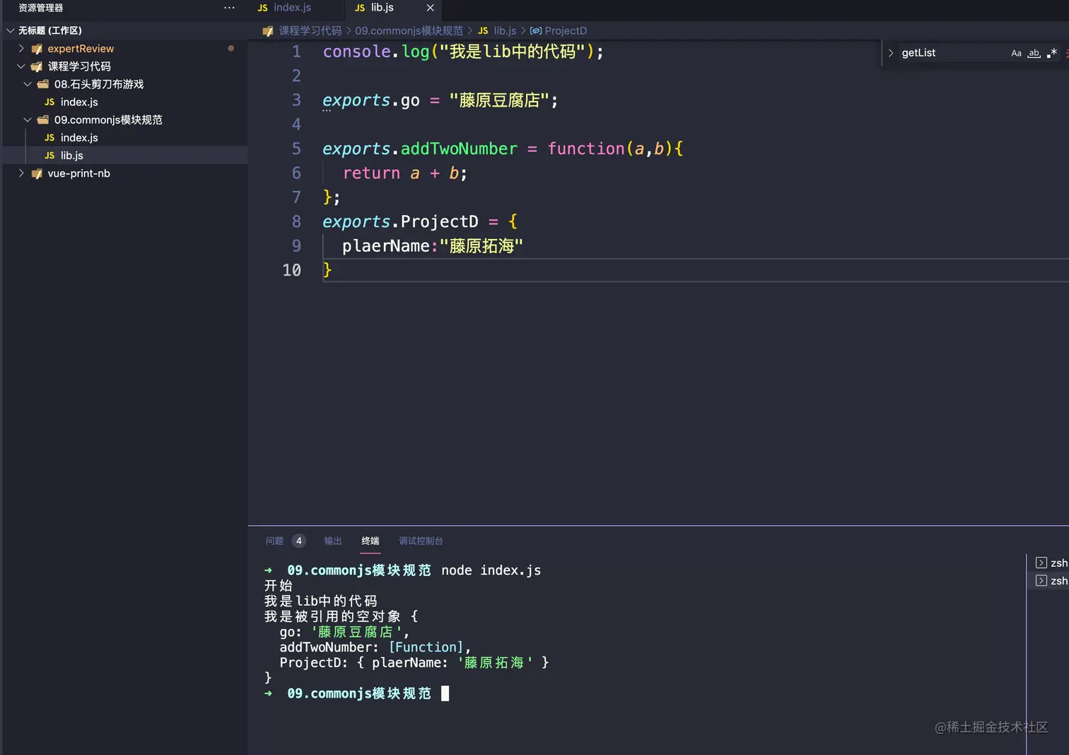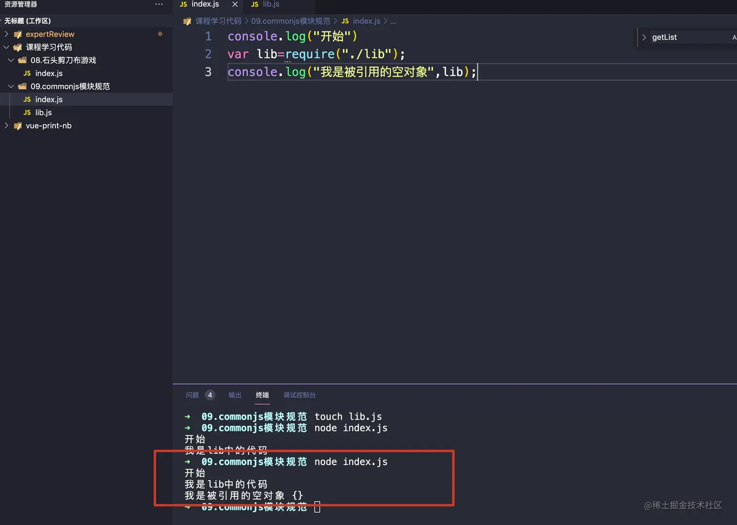 └─ lib.js//lib.js console.log("我是lib中的代码");//index.js console.log("开始") var lib=require("./lib"); console.log("我是被引用的空对象",lib); -