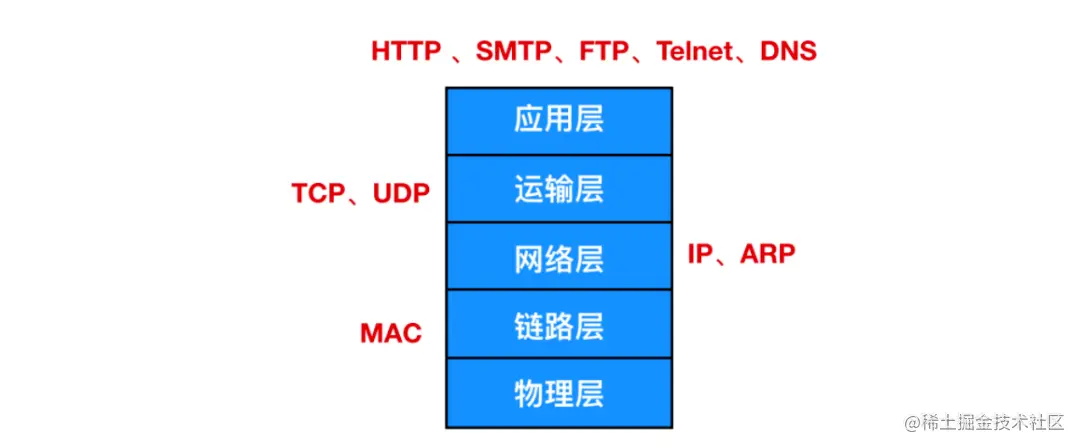说到 HTTP ,不得不提的就是 TCP/IP 网络模型,一般是五层模型。如下图所示: