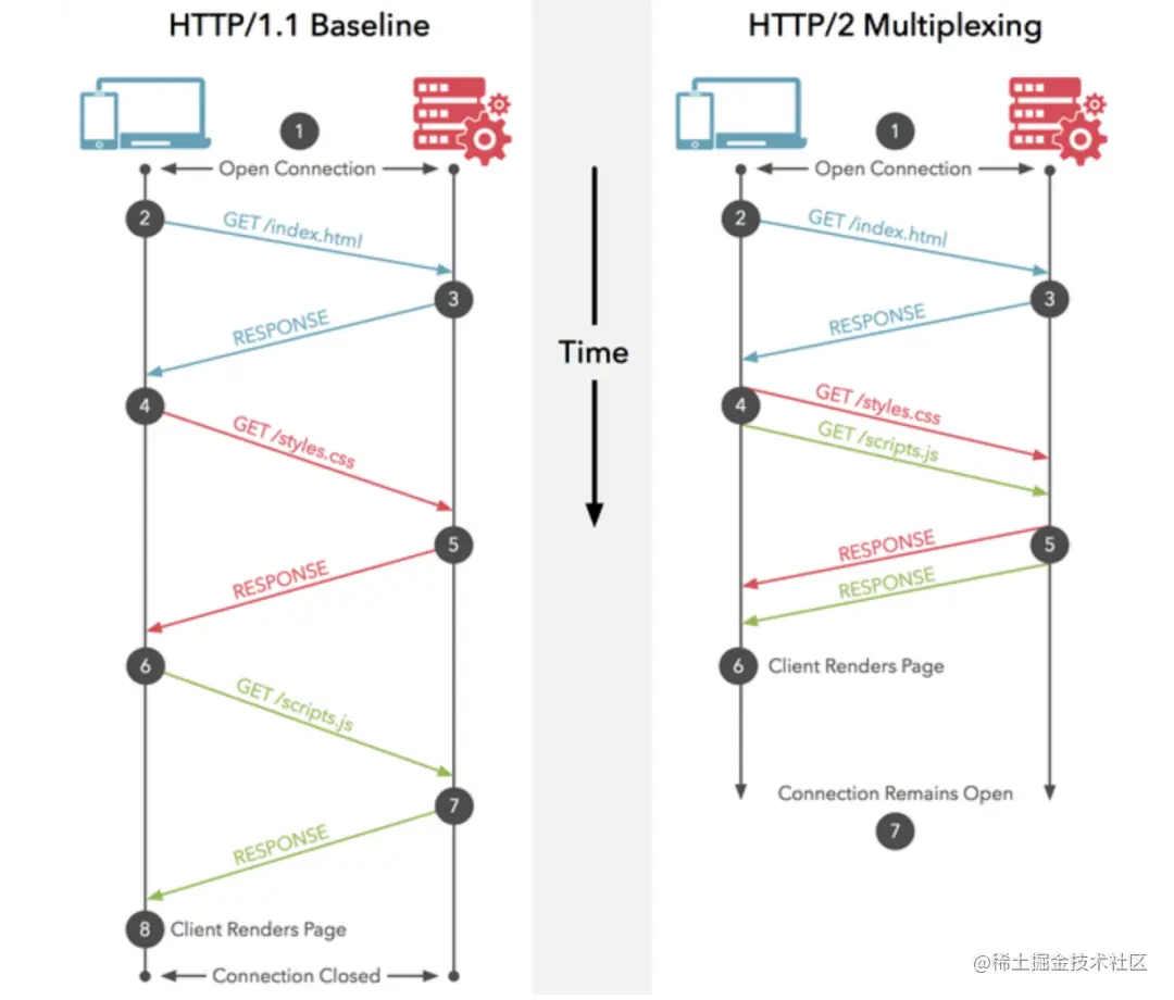 - 多路复用协议。并行的请求能在同一个链接中处理,移除了HTTP/1.x中顺序和阻塞的约束。
