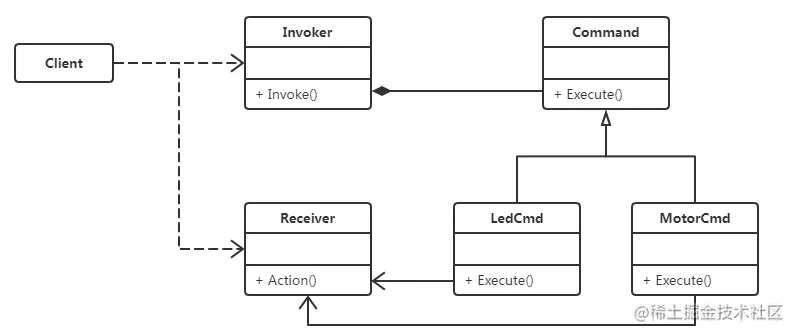 具体的命令类,其内部会持有Receiver的指针,用于将具体的命令实例和响应实例绑定。此类中,可以做一些对命令的管理等操作。