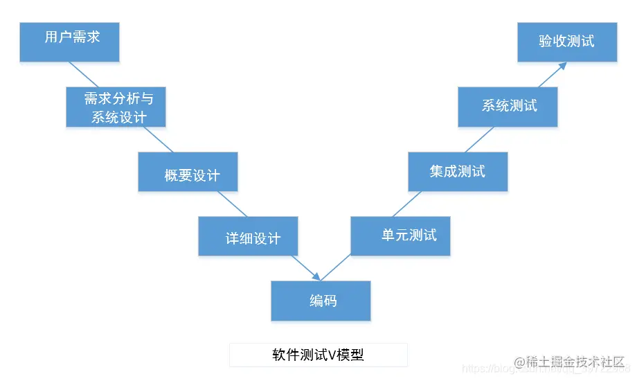 - ⭐缺陷:V 模型仅仅把测试过程作为在需求分析、系统设计及编码之后的一个阶段(🤔即开发与测试串行执行),忽视了测试对需求分析,系统设计的验证,需求的满足情况一直到后期的验收测试才被验证。