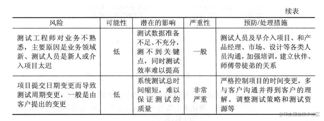 - 降低进度风险:进行测试资源、时间等估算时要留有余地,增加10%的缓冲空间,以减低测试资源可能不足的风险。