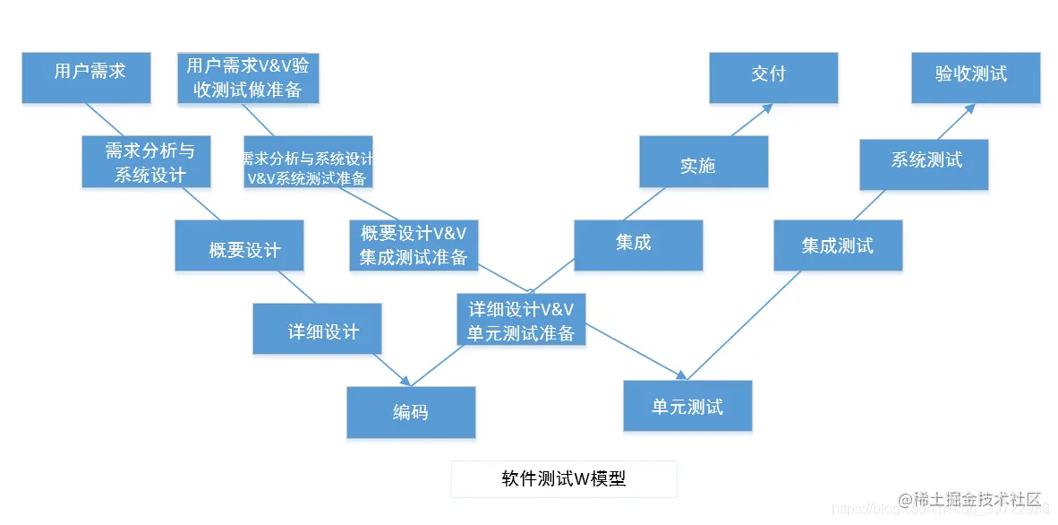 - 相对于 V 模型,W 模型增加了软件开发各阶段中同步进行的验证和确认活动。