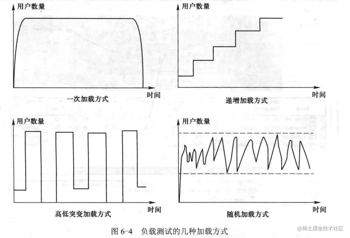 - ① 一次加载:一次性加载某个数量的用户,在预定的时间段内持续运行。获取某种确定负载下的性能指标数据,一般也采用这种加载模式。