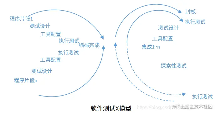 - 由图中可见,X 模型还定位了探索性测试,这是不进行事先计划的特殊类型的测试,这一方式往往能帮助有经验的测试人员在测试计划之外发现更多的软件错误。