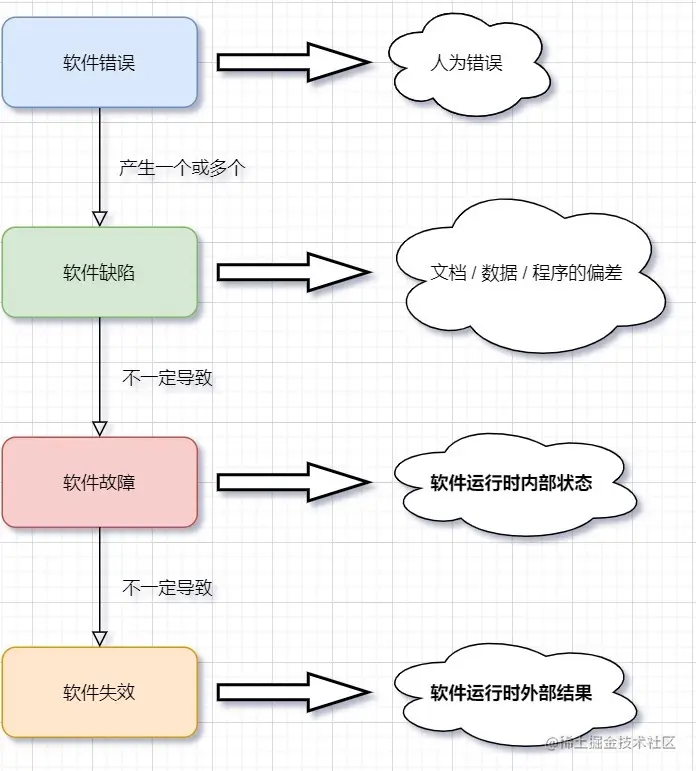 人为的错误(error) -> (代码或文档中静态地存在)缺陷(bug/defect) -> 运行时被激活引发故障(fault) -> 故障严重时导致软件失效(failure)