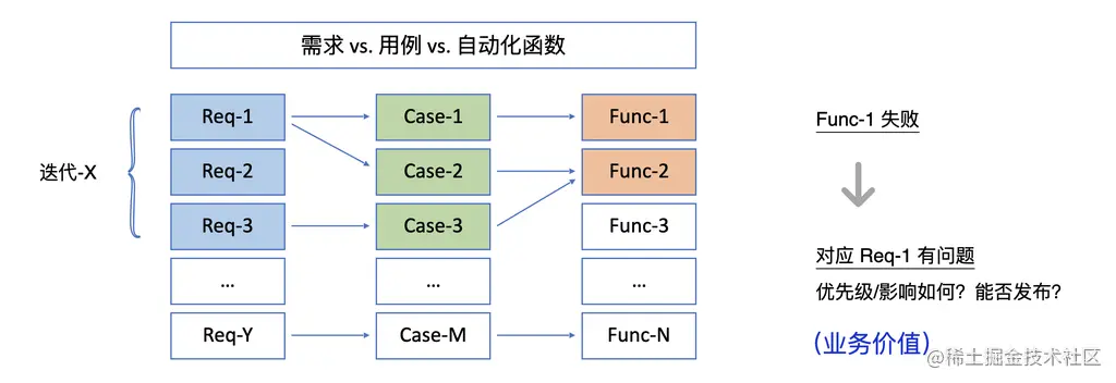 基于这样的关联关系,我们就可以顺藤摸瓜,根据某个自动化函数运行失败,找到对应哪个需求有问题,然后根据需求的优先级或者影响范围决定是否继续下一步,是打回修复问题还是决定继续发布上线。