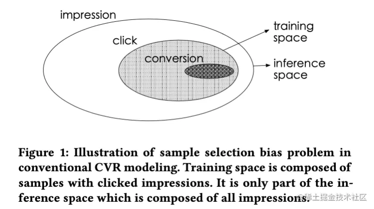 转化是在点击之后才“有可能”发生的动作,传统CVR模型通常以点击数据为训练集,其中点击未转化为负例,点击并转化为正例。但是训练好的模型实际使用时,则是对整个空间的样本进行预估,而非只对点击样本进行预估。即训练数据与实际要预测的数据来自不同分布,这个偏差对模型的泛化能力构成了很大挑战,导致模型上线后,线上业务效果往往一般。