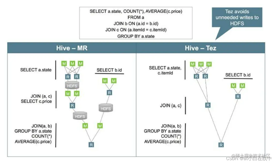 - 虚解决方案:采用presto、impala等专门的查询引擎,采用spark计算引擎替换MR/TEZ;