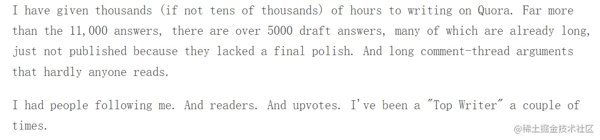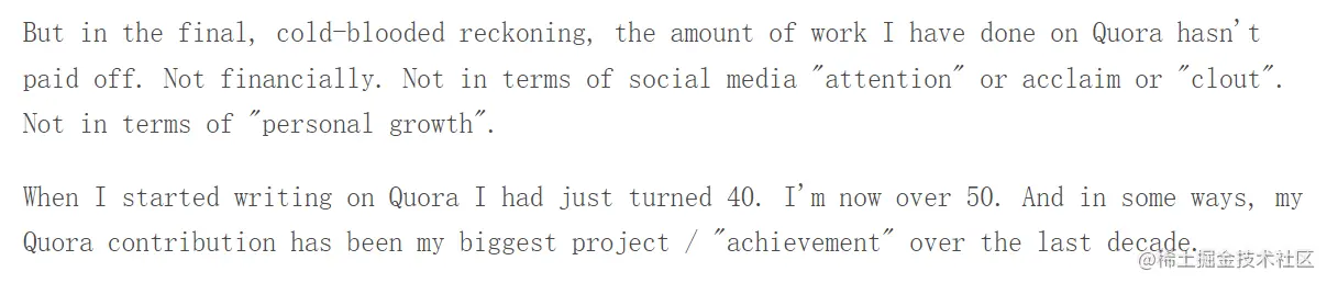 quora上写作那十年,那是一件很值得自豪的事情。但是它并没有形成价值的积累,最开始花费数小时写回答,获得了关注、赞和极大的满足感,但是慢慢的边际收益就越来越小了。十年来作者的朋友有的出书了、有的学术上小有成就、有的在影视界有所建树。而作者的成就是一堆quora平台上的回答。并不是说这些回答没有价值,而是面对十年来付出的时间、精力和才智,这十年是被"辜负"了。