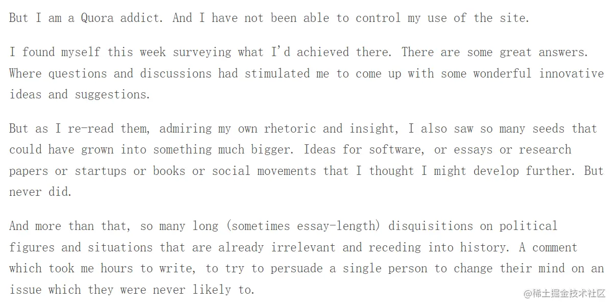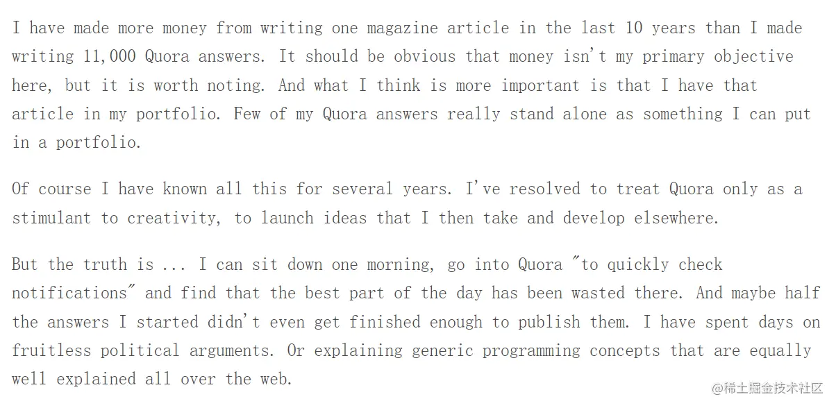 quora回答挣更多的钱,这里不是说钱的问题,但是那篇杂志文章可以放在简历中增彩,而很少quora的回答可以给履历加分。实际上,作者意识到这些情况已经很多年了,但是每次作者都是快速打开quora,查看通知,为无意义的政治问题争论不休或者解释互联网上已经有很好定义的通用编程语言概念,意识过来发现一天的时间都浪费在quora上了。