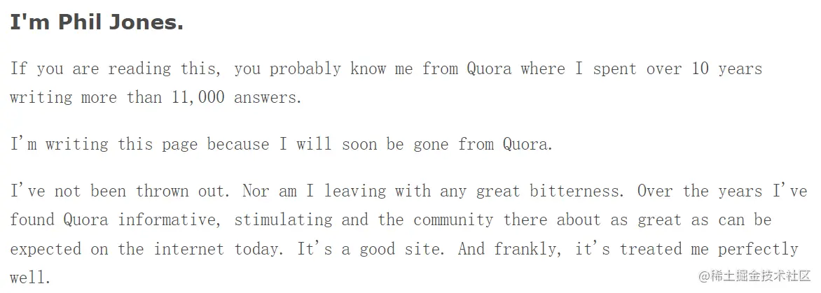 冯兄有天在Hack News上看到一个热议的帖子news.ycombinator.com/item?id=295…,看完后心情久久不能平静,Phil Jones四十岁开始在www.quora.com/平台上作为一个问题回答者,十年来共回答了11000多个提问。现在他要退出quora平台开始玩编程和音乐。文中Phil Jones说十年来她付出了很多,然而收获并不匹配,十年的努力被"辜负"了,该谁来负责?