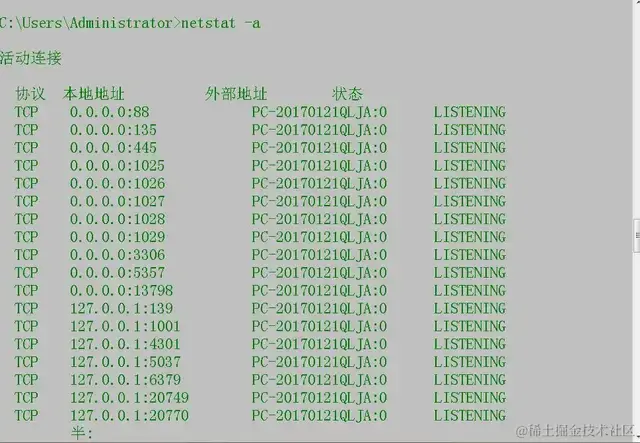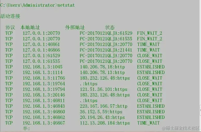 再来看看使用咱们的CMD,我们来使用一个命令”netstat“,这个命令可以监听TCP和UDP的连接,下面来看看: