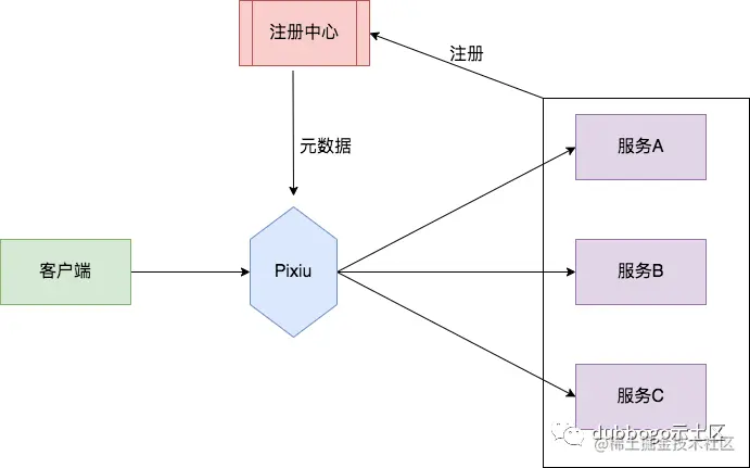 如上图所示,服务A、B、C 进行服务注册,将自身元数据存储在注册中心。而 Pixiu 则从注册中心拉取注册的服务元数据,构建自己的路由规则和转发集群配置。当客户端发送请求时,Pixiu 会基于构建的转发规则,将请求转发给对应的后端服务。