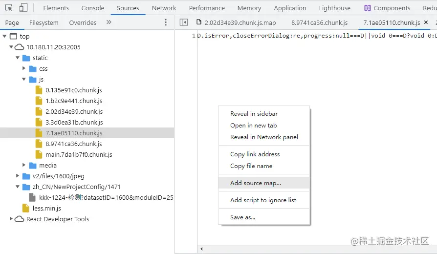 - F12打开浏览器开发者工具的Sources面板。选择问题代码文件,右键菜单处点击Add source map...