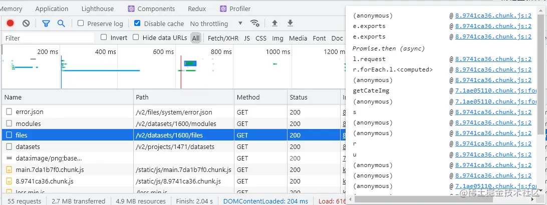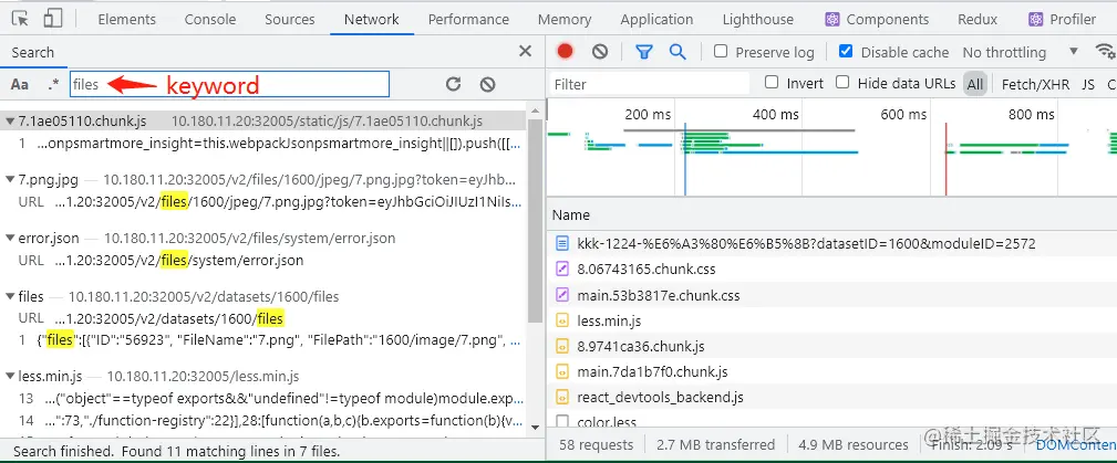 1.在浏览器的network面板中输入问题代码处的相关的(编译后的)关键字,查找到相关接口后,可以看到代码所在的编译打包后的chunk文件。
