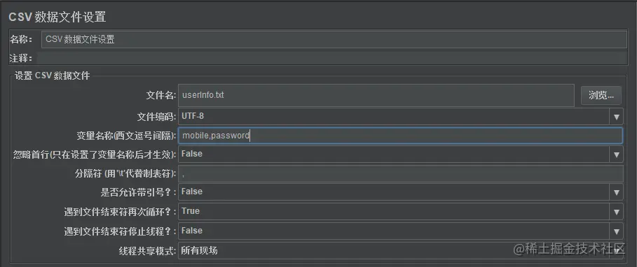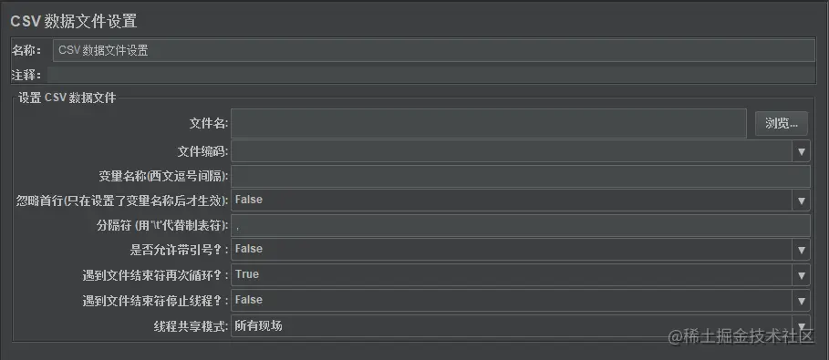 线程组右键–>添加–>配置元件–>CSV Data Set Config,就创建了一个CSV,界面是这个样子的: