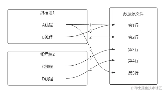 All threads:所有线程。如果脚本有多个线程组,在这种模式下,各线程组的所有线程也要依次唯一顺序取值。例如,脚本有2个线程组,各有2个线程,文件内有5行数据,脚本运行时,将如下图一样循环往复取值: