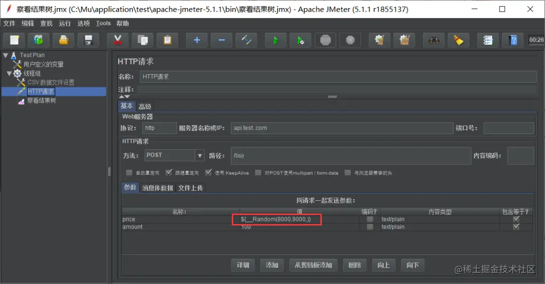 上图中,生成了一个表达式:${__Random(8000,9000,)},我们用这个表达式替换想要参数化的变量值,例如下图中的price变量:
