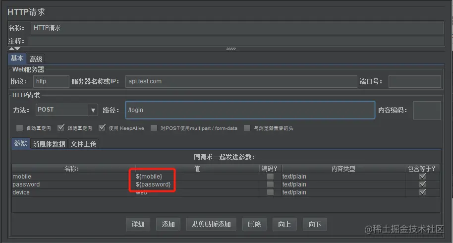 如上图,用起来也很简单,添加变量名和相对应的值就可以了。后面引用变量和前面一样,使用${mobile}的方式。