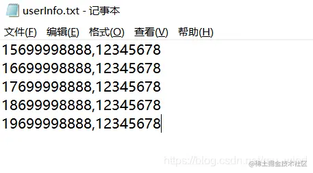 下面看一个实例。首先有userInfo.txt的文件,放置在bin目录中,内容如下: