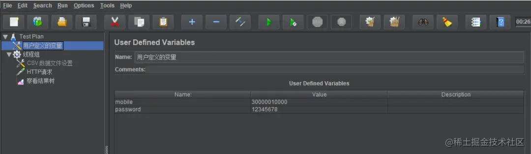 创建方式:线程组上右键–>配置元件(config element)–>用户定义的变量。