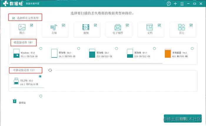 完成软件的安装后就能进行软件的运行了,在开始窗口,根据软件的提示,选择数据文件的类型和路径。接着点击右下角的【扫描】,完成文件的扫描。