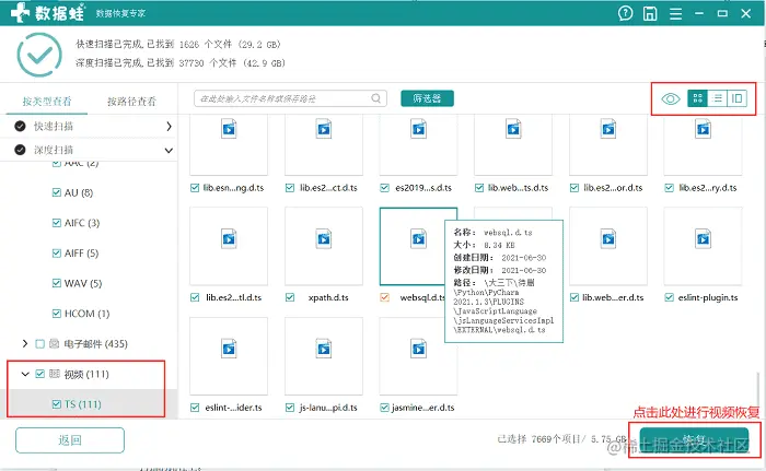 步骤二:在文件的扫描阶段中,单击左侧的文件格式,可以对扫描出来的文件进行筛选。单击文件,可以查看文件的基本信息。