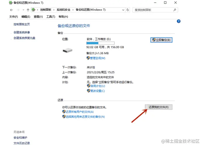 步骤二:单击备份和还原,在弹窗中单击【还原我的文件】。