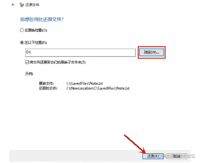 步骤四:勾选备份文件保存的路径。勾选【在原始的位置】,文件就会被复原到原位。勾选【在以下位置】,单击浏览文件夹,选定文件路径亦可以完成文件的保存。