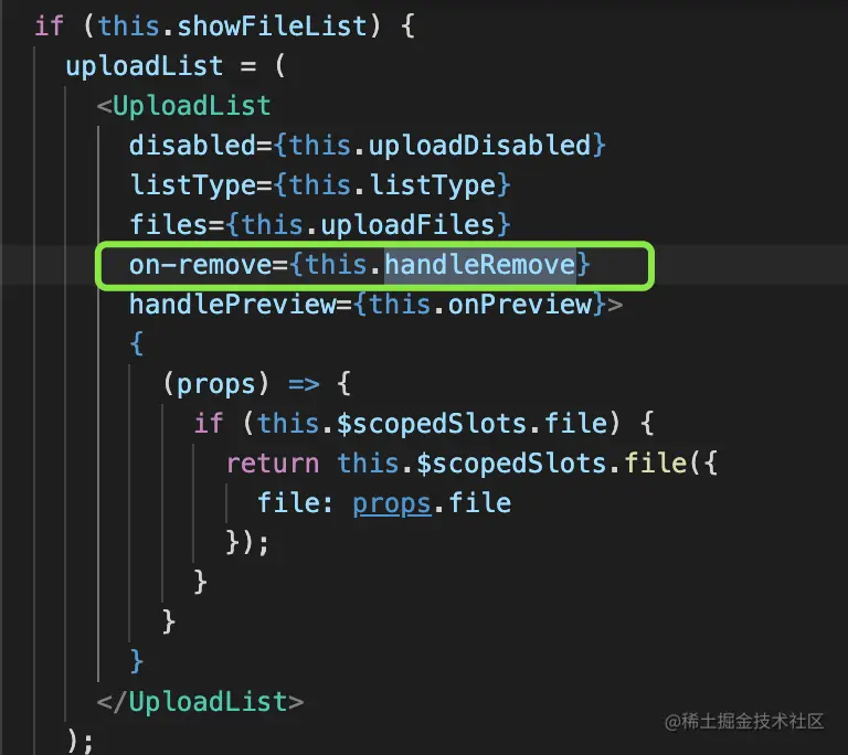 外层是for循环生成li,这段代码主要是遍历多个文件,生成文件的列表。注意绑定的键盘事件,点击delete键触发remove方法,这和index.vue中的代码对应,如下图所示: