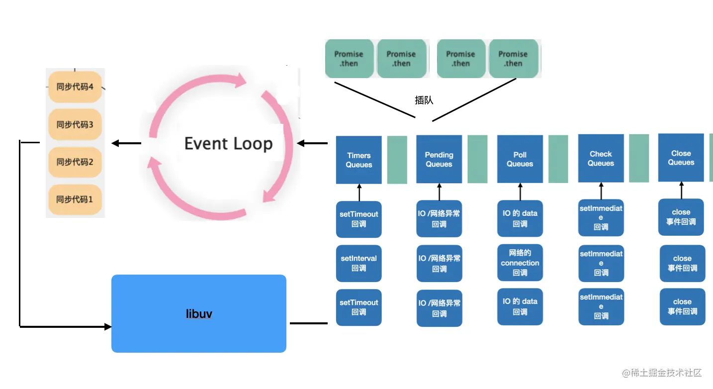 Node.js 是一个新的 JS 运行环境,它同样要支持异步逻辑,包括定时器、IO、网络请求,很明显,也可以用 Event Loop 那一套来跑。