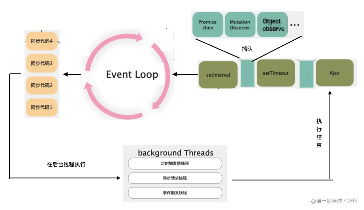 其中,定时器、网络请求其实都是在别的线程执行的,执行完了之后在任务队列里放个任务,告诉主线程可以继续往下执行了。