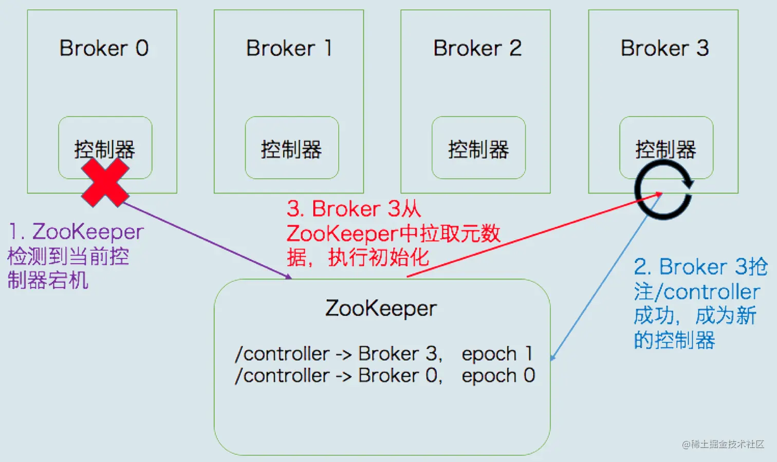最开始时,Broker 0 是控制器。当 Broker 0 宕机后,ZooKeeper 通过 Watch 机制感知到并删除了 /controller 临时节点。