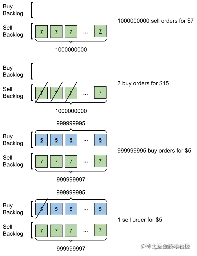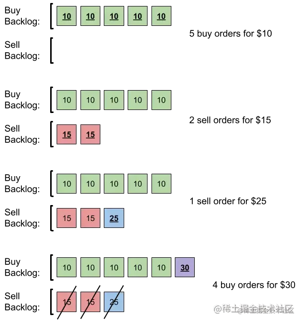 buy,则可以查看积压订单中价格 最低 的销售订单sell。如果该销售订单sell的价格 低于或等于 当前采购订单buy的价格,则匹配并执行这两笔订单,并将销售订单sell从积压订单中删除。否则,采购订单buy将会添加到积压订单中。 - 反之亦然,如果该订单是一笔销售订单