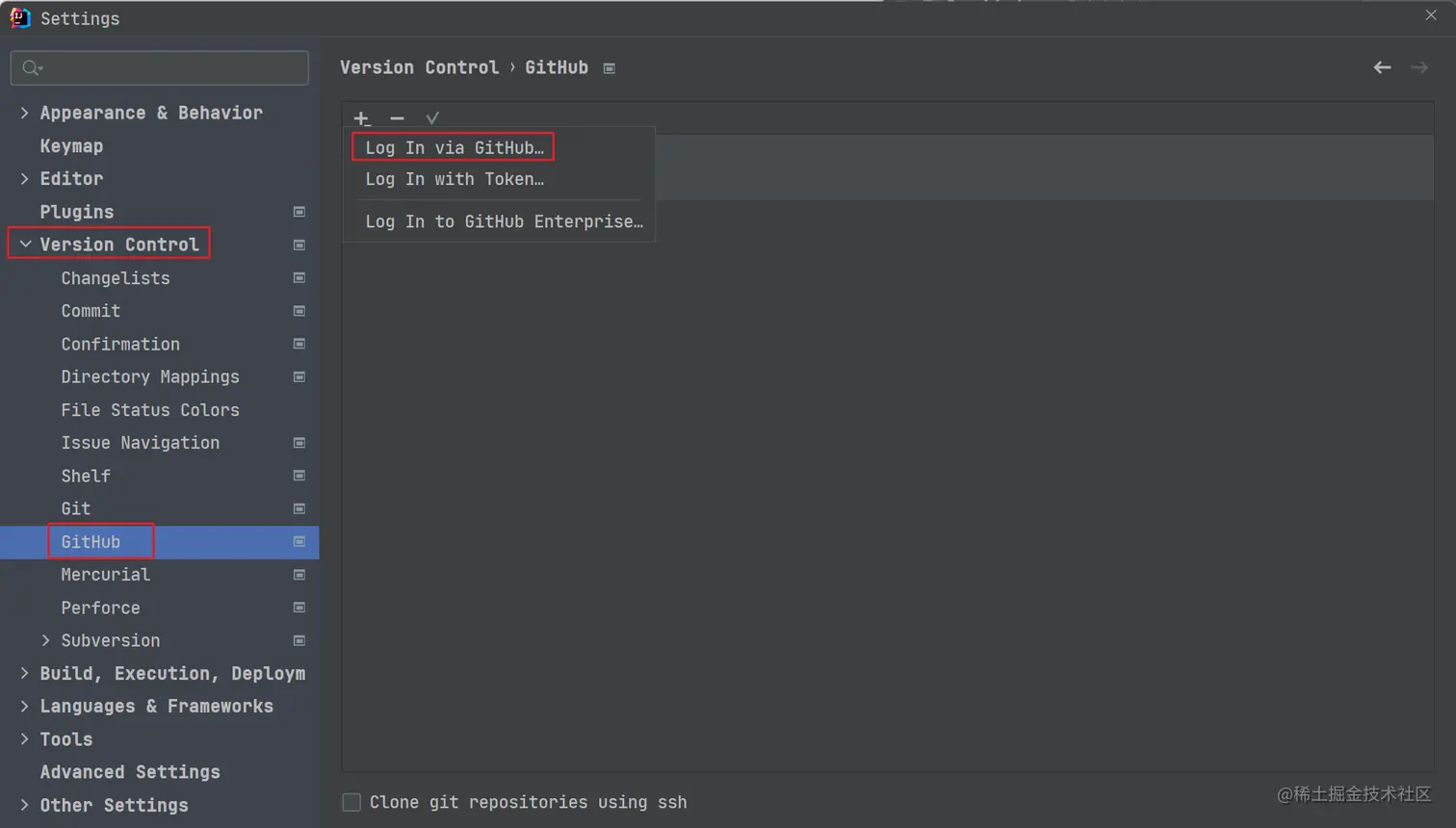 同样的,我们可以发现 Version Control 中还有一个 Github 选项卡,这里我们可以使用自己的 Github 账号进行登录,即 Log In via Github,然后就可以直接将我们 Github 上的代码拉取下来了。