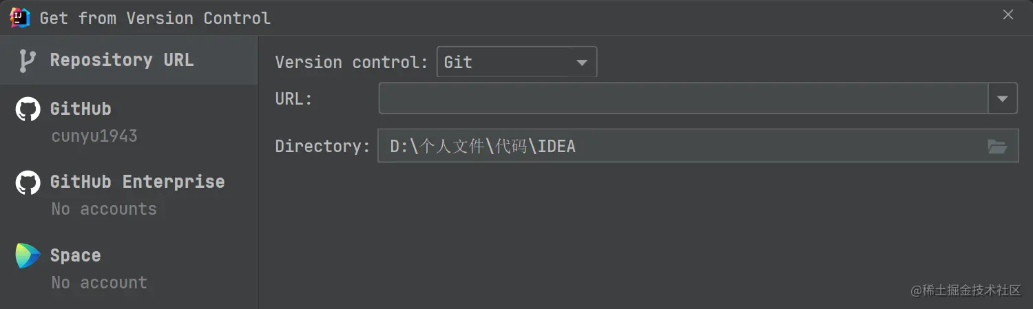这里我们将我们在上一部分中所复制的仓库库地址 url 填入 URL,然后 Version control 选择 Git,Directory 则是我们要存放该代码的本机路径,后面拉取下来的代码将放在该路径中。