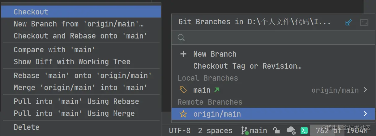 此时就需要关注下 IDEA 底部的状态栏了,在这里我们不仅可以切换不同分支,还能进行新建分支、Checkout 分支代码、Compare 分支代码、Rebase、Merge、Pull 等一系列操作。