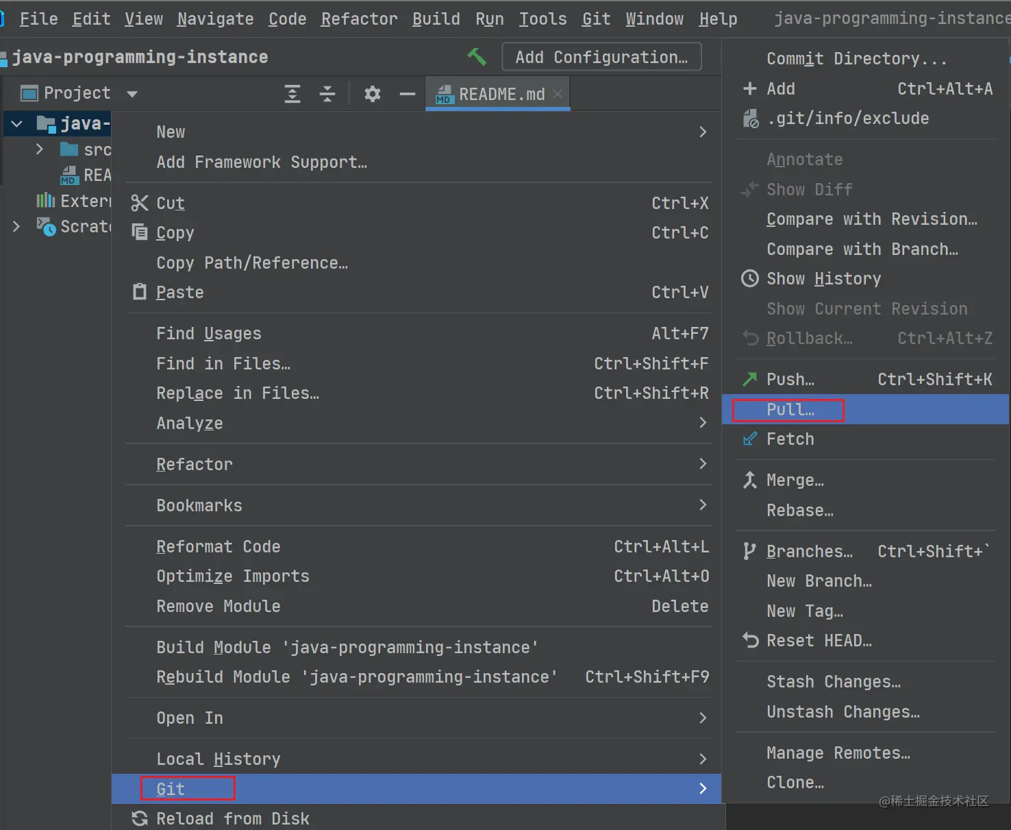 除开快捷键和点击工具栏中按钮更新的方式之外,还可以在项目上点击鼠标右键,然后依次进入 Git -> Pull 进行更新。