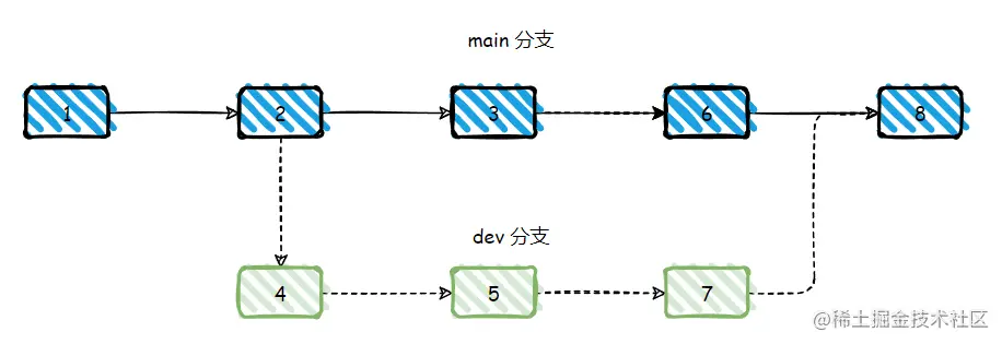 Rebase 则是重新基于一个分支进行 commit,即将当前分支从祖先的 commit 后所提交的 commit 均撤销,将他们放到一个缓存中,然后基于一个分支的后面,将缓存的 commit 按照顺序以一个个新增到该分支后面,用图表示如下,将 4 和 5 所提交的 commit 放到缓存中,然后按顺序将其新增到 6 的后面。