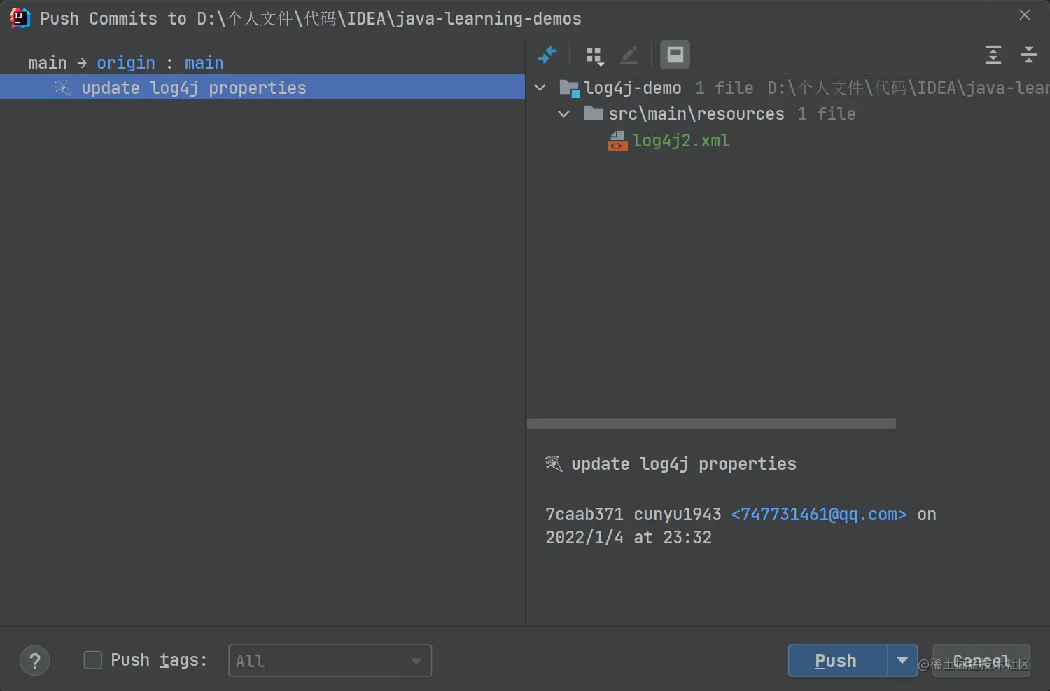 可能在提交时,大家会发现左下角除了 Commit 按钮之外,还存在一个 Commit and Push 按钮。通过点击该按钮,我们就可以在提交的同时弹出推送解码,然后点击需要推送的记录,点击右下方的 Push 按钮即可。