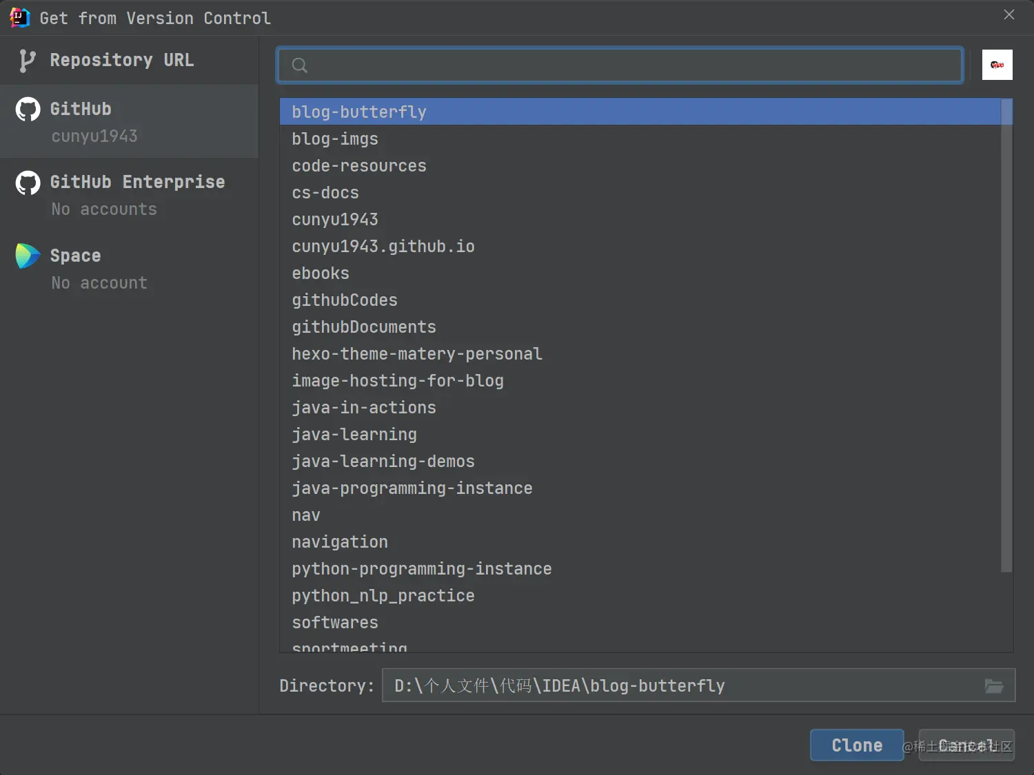 Github 设置部分我们已经登陆了 Github 账号,此时也可以通过 Github 选项,然后找到我们要拉取代码的仓库,这里可以通过最上方的搜索框进行搜索快速定位,然后点击下方的 Clone 即可进行拉取,其中 Directory 同上一种拉取方式,也是我们拉取代码存放的路径。
