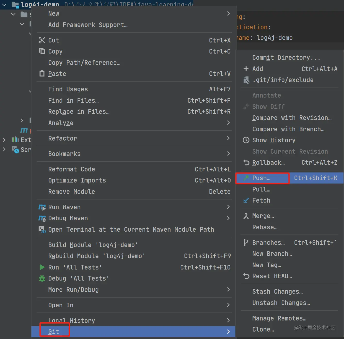 通过在项目上点击鼠标右键,然后选择 Git -> Push,同样可以进行我们的推送工作。