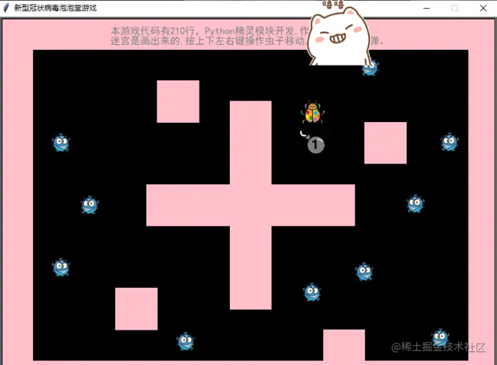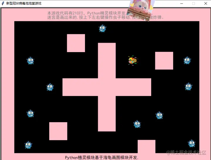 安装方法 pip install sprites 程序中迷宫房间是画出来的,当然虫子是不能穿越过去,也不能碰到病毒...