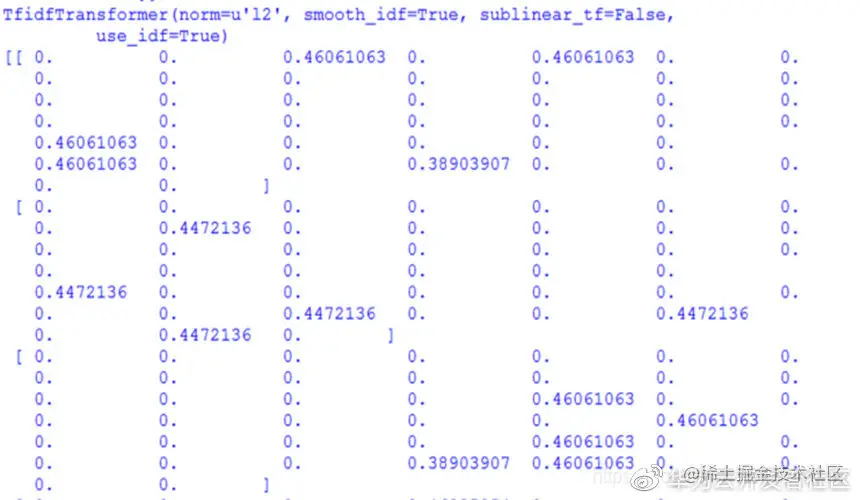 当使用CountVectorizer类计算得到词频矩阵后,接下来通过TfidfTransformer类实现统计vectorizer变量中每个词语的TF-IDF值。TF-IDF值采用矩阵数组的形式存储,每一行数据代表一个文本语料,每一行的每一列都代表其中一个特征对应的权重,得到TF-IDF后就可以运用各种数据分析算法进行分析,比如聚类分析、LDA主题分布、舆情分析等等。