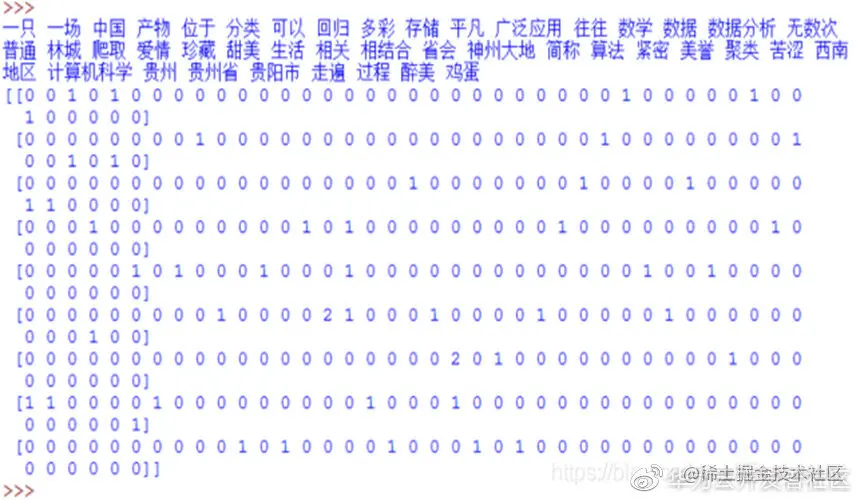 该类是将文本词转换为词频矩阵的形式。比如“I am a teacher”文本共包含四个单词,它们对应单词的词频均为1,“I”、“am”、“a”、“teacher”分别出现一次。CountVectorizer将生成一个矩阵 a[M][N],共M个文本语料,N个单词,比如a[i][j]表示单词j在i类文本下的词频。再调用fit_transform()函数计算各个词语出现的次数,get_feature_names()函数获取词库中的所有文本关键词。
